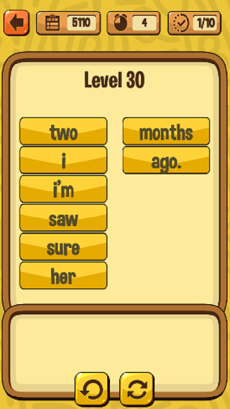 C'est facile. Le jeu consiste à ordonner les mots mélangés de chaque niveau pour former une phrase correcte et apprendre l'anglais de manière ludique. Avec différents niveaux de difficulté, le jeu facilite l'apprentissage de la grammaire anglaise. Si vous faites une erreur et cliquez sur le mot anglais dans le mauvais ordre, vous perdrez des points. De plus, si vous terminez la phrase très rapidement, vous obtiendrez un bonus de points. Au fur et à mesure que vous progressez dans les niveaux, vous accumulerez des points.