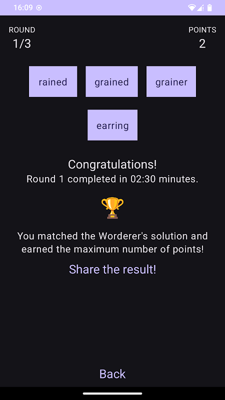 Vous pouvez également résoudre le défi à l'envers en transformant le dernier mot connu. Touchez le mot pour ouvrir sa fiche Wiktionnaire et sa signification. L'utilisation d'un indice vous coûtera des points.