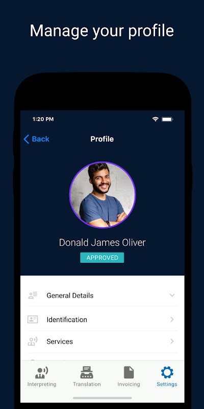 Dans l'application, vous pouvez consulter vos réservations, recevoir et accepter des missions, facturer les missions que vous livrez et mettre à jour les informations de votre profil de linguiste personnel quand vous le souhaitez - qu'il s'agisse de données personnelles, de nouvelles qualifications ou de certificats de sécurité.