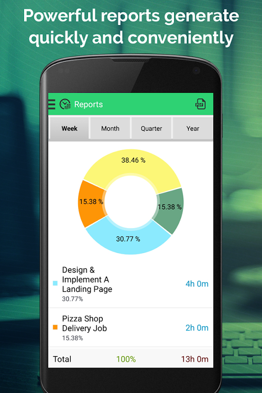 Il vous donne des reportages exclusifs en hebdomadaire, mensuelle, trimestrielle et annuelle. Il calcule votre revenu basé sur la période de paie définie pour plusieurs clients ou des emplois. Vous pouvez également exporter vos journaux de travail par courriel en format de fichier PDF, CSV ou HTML.