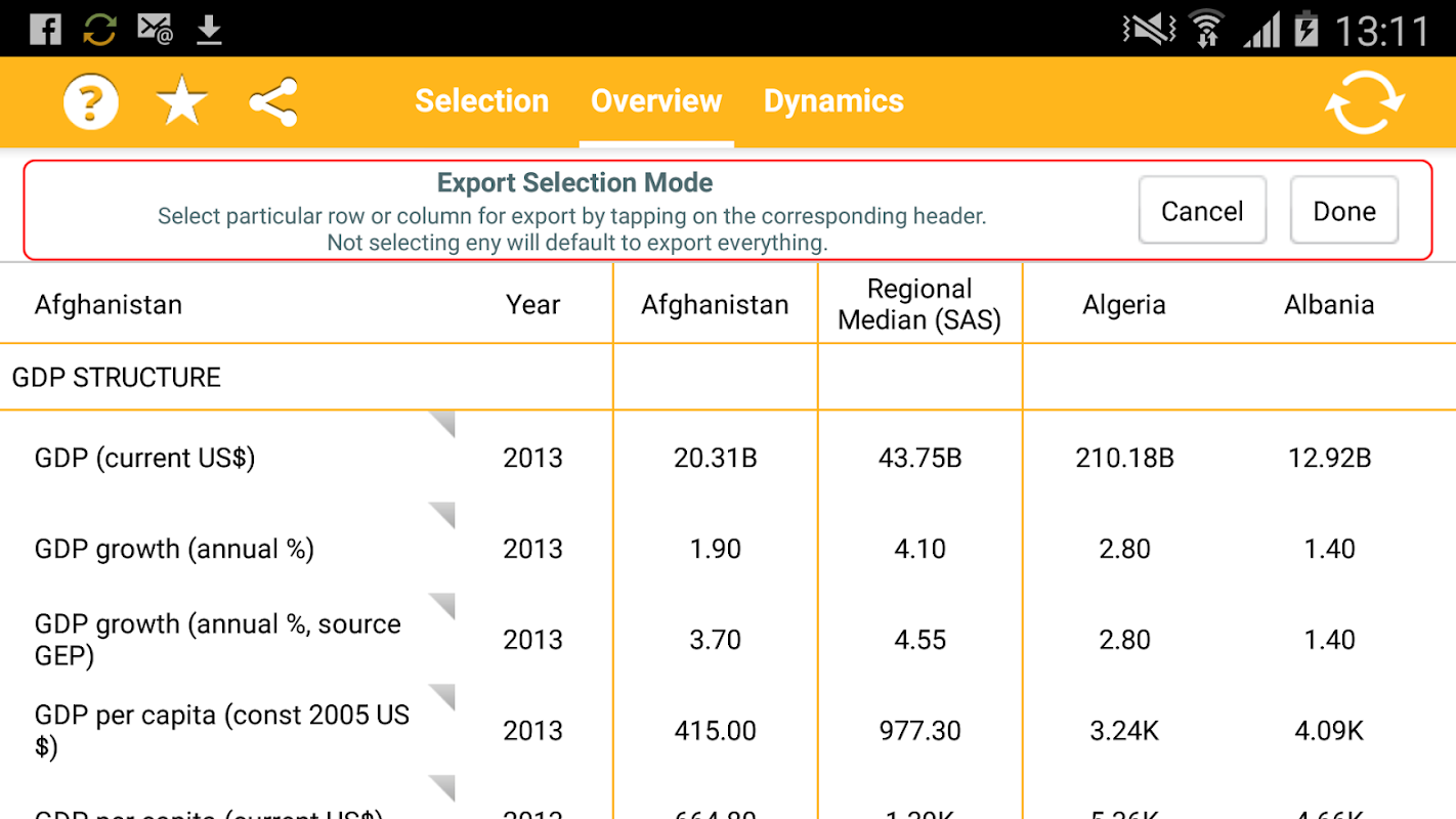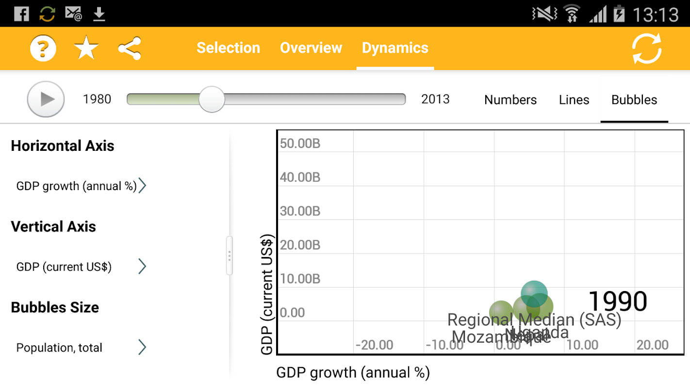 • WB MacroStats combines data access on the go with an appealing visual analysis. The app was exclusively designed for mobile platforms, and it features dynamic bubble charts and customizable tables that can be easily exported by the user. • WB MacroStats uses a simple algorithm with two customizable criteria (per default, GDP per capita and population) and adjustable weights that allows for the automatic selection of peer countries.