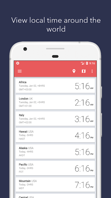Voir l'heure locale dans tous les fuseaux horaires du monde entier. Recherche et ajouter des milliers de location; alimenté par Google. Construisez et personnalisez votre liste de favoris, vous pouvez renommer ne importe quel endroit à tout ce que vous voulez. Voir votre liste de favoris sur une carte interactive. Simple, belle et facile à utiliser.