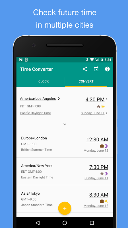 En pensant à organiser une réunion avec quelqu'un de New York lundi matin? Ce n'est probablement pas une bonne idée si vous travaillez à Tokyo. Cette application résout le problème en montrant clairement si c'est le jour de semaine ou le week-end, et si c'est la journée ou le soir dans un fuseau horaire différent.