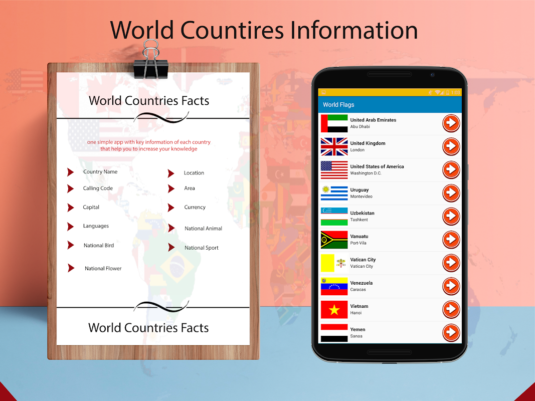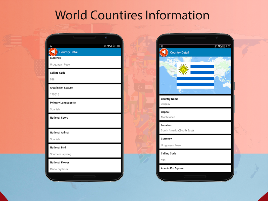 World Encyclopedia, gives information of all countries, App contains information like Capitals, Currency, Flag, Language, Calling Code, National Animal, National Flower etc