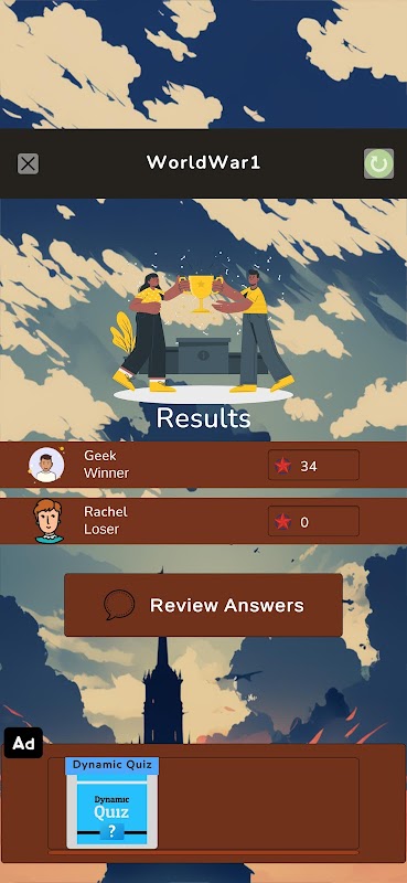 Plongez dans les tranchées de l'histoire avec notre jeu de quiz multijoueur immersif, où vous pouvez défier vos amis ou concourir à l'échelle mondiale pour tester vos connaissances sur la Première Guerre mondiale ! Vivez le drame, l'héroïsme et les moments cruciaux de ce conflit monumental comme jamais auparavant.