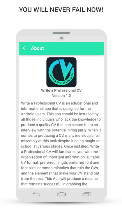 Write a Professional CV provides the app users with step-by-step instructions that will help them write a perfect CV. Furthermore, this app can teach you how to write professional CV with preferable font size, font type, and categorize the educational and other significant experience with respect to their importance.