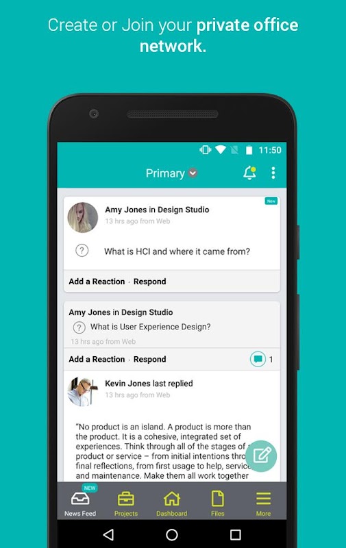 Toutes les fonctionnalités sont intégrées de manière transparente, ce qui vous permet de passer de la lecture du microblog de votre équipe à celle de poser des questions privées par messagerie instantanée. Wupdate pour Android vous permet de collaborer en temps réel en utilisant le support de communication le mieux adapté à votre situation, que vous soyez au bureau, à la maison, dans le train ou même faire la queue.