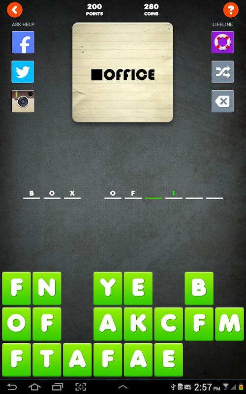 ★ Still stuck? Don’t worry, you can ask your friends on Facebook, Twitter and Instagram for help on whats the saying or get more random ideas for whats the word by simply shuffling around the letters with the “Shuffle” feature.