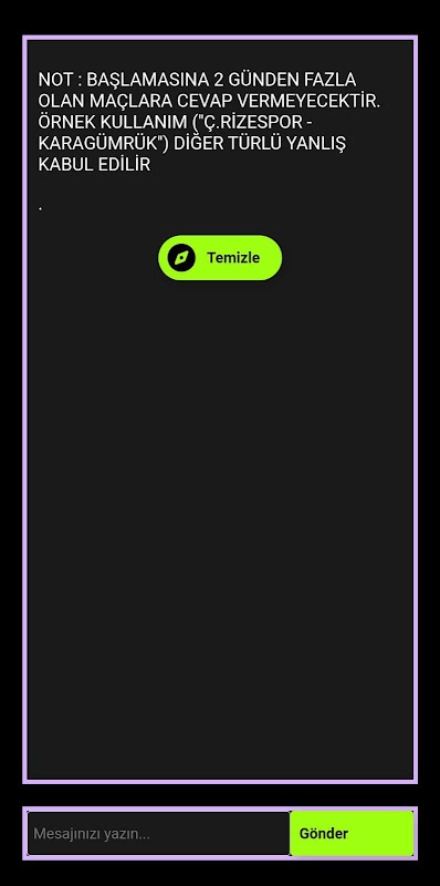 L'intelligence artificielle de notre application reconnaît les équipes turques de Spor Toto Super League et répond uniquement aux matchs de Spor Toto Super League. Pour que l'intelligence artificielle trouve le match et fasse des pronostics, les matchs doivent avoir lieu pendant la journée. Disons que si une équipe a un match pendant la journée, vous pouvez demander un pronostic pour cette équipe. Sinon, il ne peut pas répondre. Notre application de prédiction de matchs de super ligue sportive à intelligence artificielle a une interface simple et est très simple à utiliser.