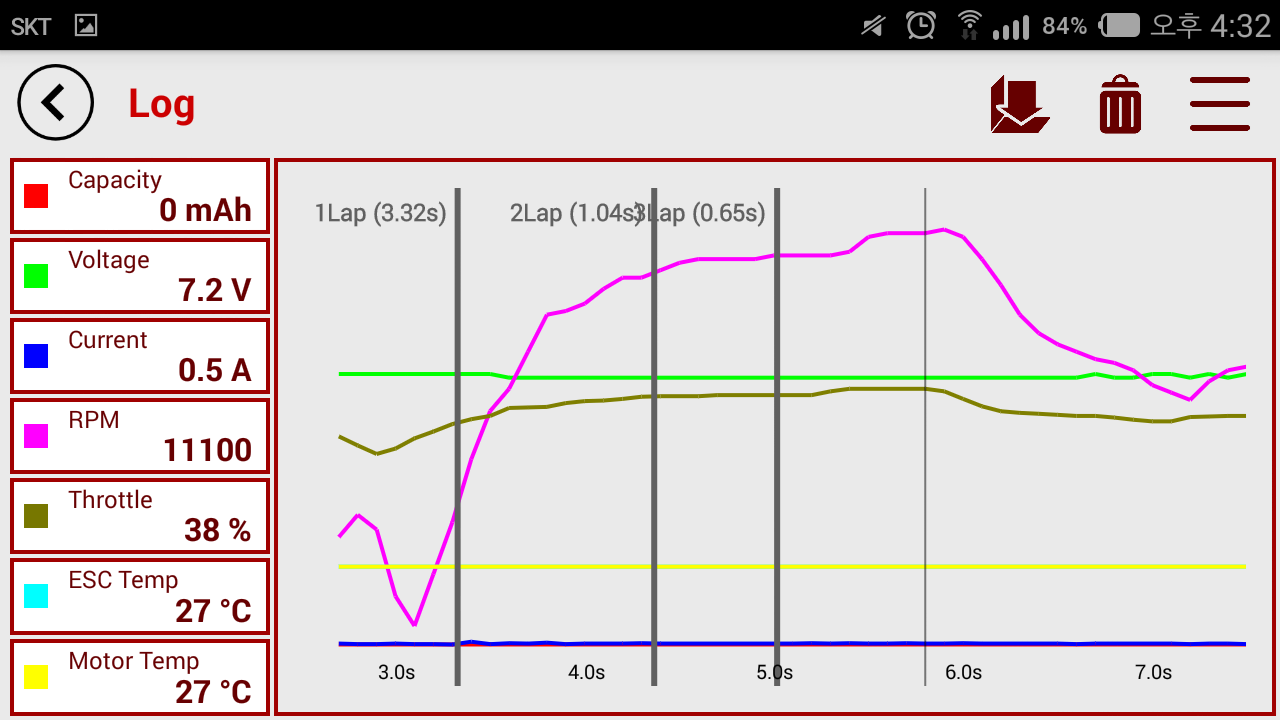 Vitesse de rotation après avoir voyagé dans l'écran du journal, courant, tension de la batterie, la température ESC, température du moteur, afficher l'ouverture émetteur d'accélérateur au graphe