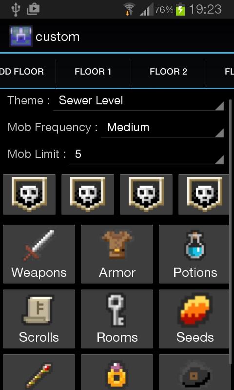 Vous pouvez créer jusqu'à 10 donjons personnalisés (de n'importe quelle profondeur). Cliquez longuement sur un fichier dans la première page de l'éditeur de carte pour accéder à la boîte de dialogue de suppression.