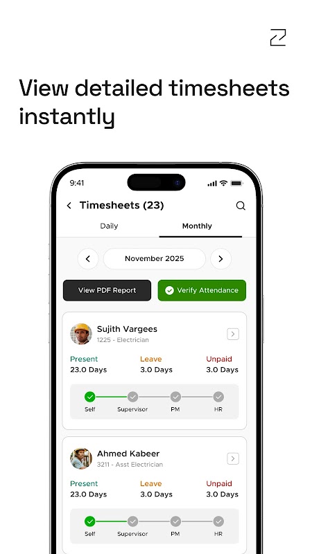 Zaper Staff is a workforce management app designed for construction field workers. It helps track attendance efficiently using face recognition. Users can log in with their mobile number, update their profile photo, and register their face with five-angle photos. The app allows daily check-ins and check-outs, showing total work time and any applicable late fines.