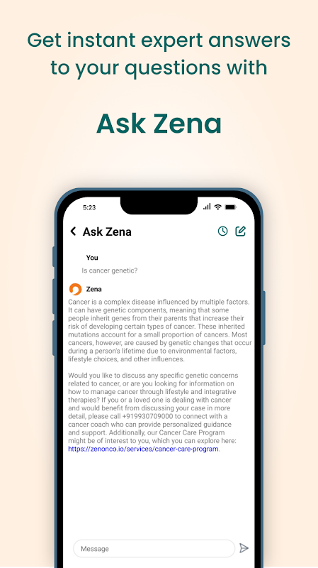 Présentation de ZenOnco Cancer Care App, une application compatissante et de soutien qui comprend profondément les défis auxquels vous êtes confronté en tant que patient atteint de cancer ou soignant. Notre mission profonde est d'être votre compagnon constant tout au long de votre voyage, en vous offrant un soutien complet adapté à vos besoins. Avec ZenOnco.io, vous n'êtes jamais seul. L'application ZenOnco Cancer Care est disponible 24 heures sur 24, 7 jours sur 7, créant un environnement sécurisé et accueillant où vous pouvez trouver de l'aide, vous connecter avec d'autres, demander conseil et accéder à des ressources précieuses. Ayant déjà touché la vie de plus de 100 000 personnes et comptant, nous sommes motivés par le désir d'avoir un impact positif sur votre vie.