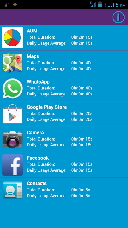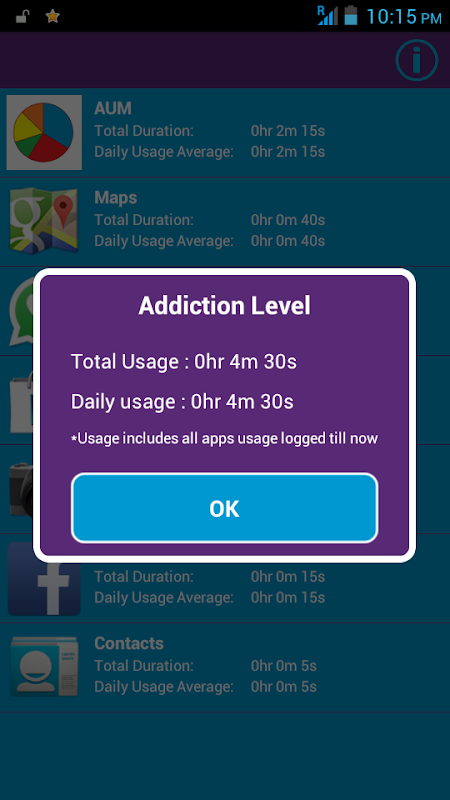 It basically monitors the time spent by you on various apps. Also, it calculates the till now total time spend by you on each and every app plus calculates the average time spent by you daily on those apps. This way you can regularly check your addiction level to your most loved apps.