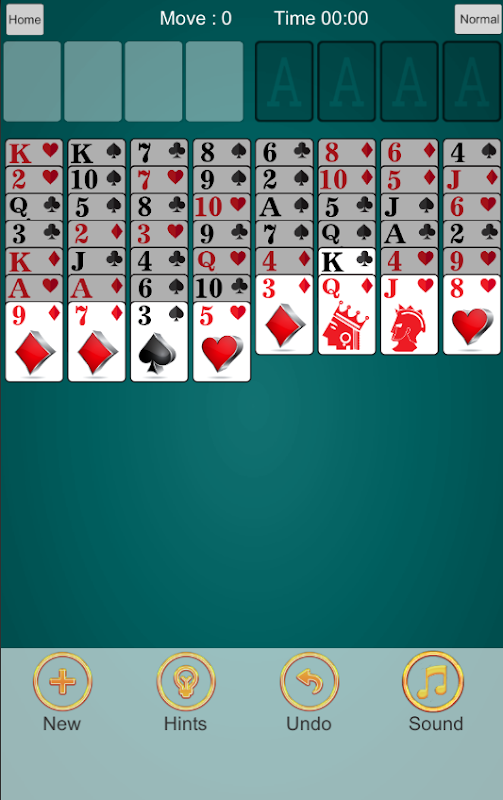 Freecell Plus is a one-deck Solitaire card game. All cards are dealt into 8 piles. Four cells (in the top left corner) and four foundation piles(in the top right hand corner)are placed above the board piles.