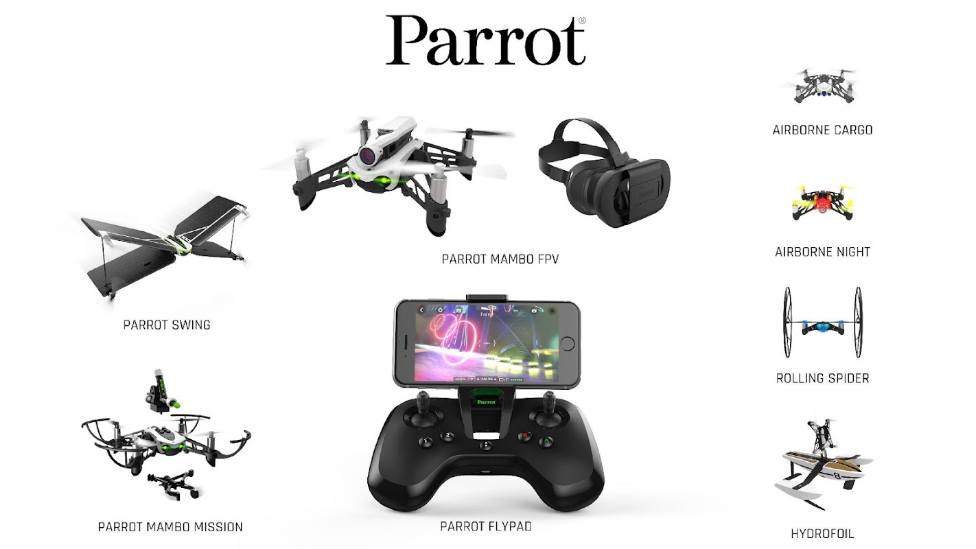 List of drones compatible with this application: Parrot Mambo, Parrot Swing, Parrot Minidrones Airborne Night and Cargo, Hydrofoil*, and Rolling Spider.