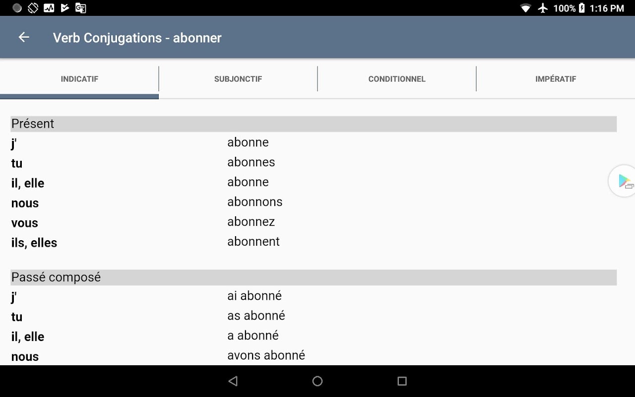 + Integrated verb conjugator: see conjugations of more than 9000 french verbs!