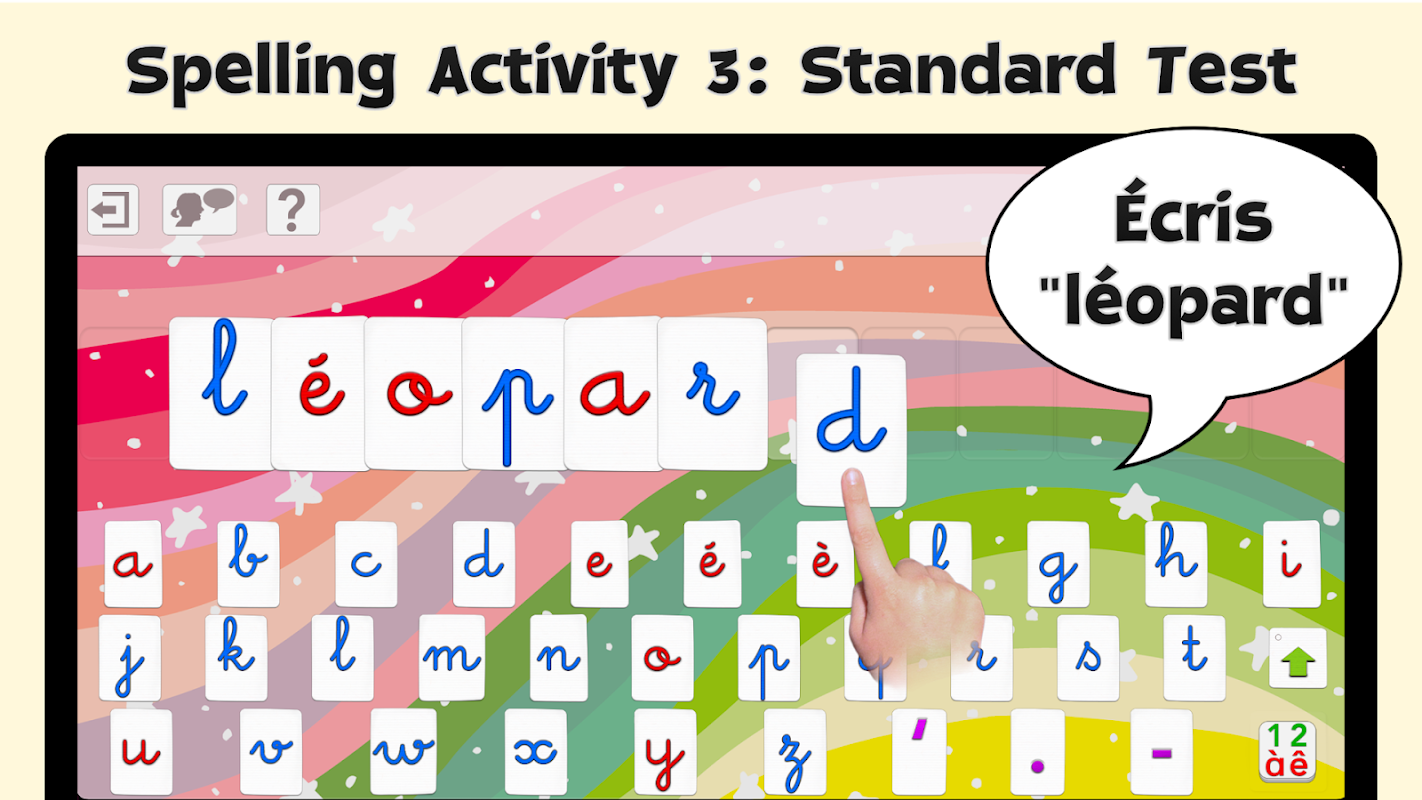 • A talking Movable Alphabet that allows kids to experiment with phonics and learn french word building thanks to the advanced text to speech engine.