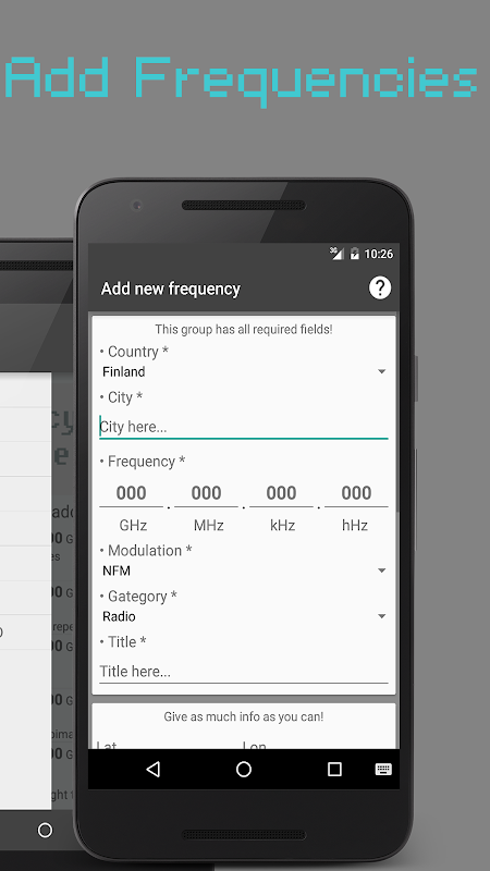 Frequency Database is user maintained database for different frequencies. This app suits from hobbyist to anyone looking for information about frequencies. If you are a SDR (Software Defined Radio) or ham radio user and you found interesting frequency, you can add it to FRDB service and wait someone to identify what it's all about. Or if you know the frequency, you can add it to FRDB service for others to see. I as an admin will verify that user added freq card contains appropriate content so that it is suitable for younger generation too. That's why adds will not be visible right away.