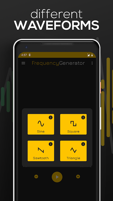 Frequency Sound Generator allows you to easily change the soundwaves from the main menu. Simply tap on the sound wave icon and pick between sine, square, sawtooth or triangle. Additionally, pick from a wide variety of notes by taping the notes 🎵 icon.