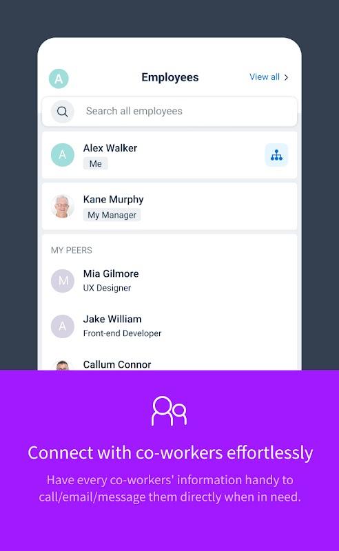 • Browse and connect with your co-workers in your company's departments