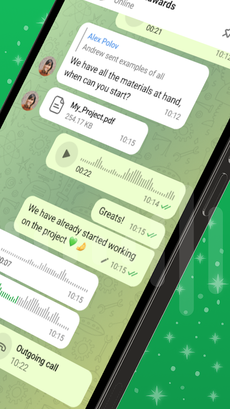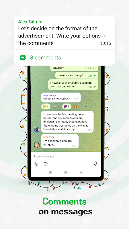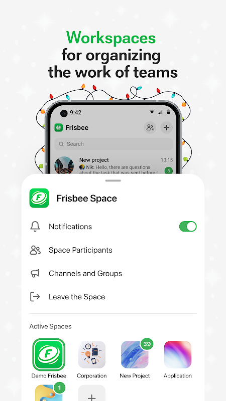 You can create social spaces in Frisbee and organize colleagues into groups based on tasks and interests. There you can exchange messages, calls, media files and links, as well as documents of any format.