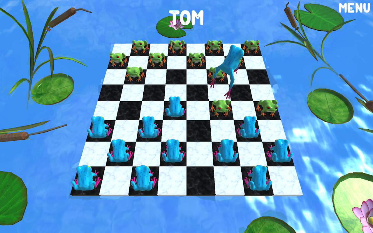 This game uses the normal rules so please learn them before you play. You must move each frog in a diagonal direction with the aim of capturing all of your opponent's frogs. A frog can only move forward until it reaches the end where it will become a king and then be able to move backwards.