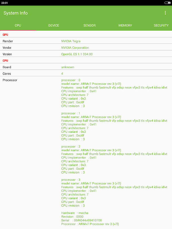 System info gives you your hardware and software information like CPU,GPU, android mobile os version and also provides your device memory info and display info.