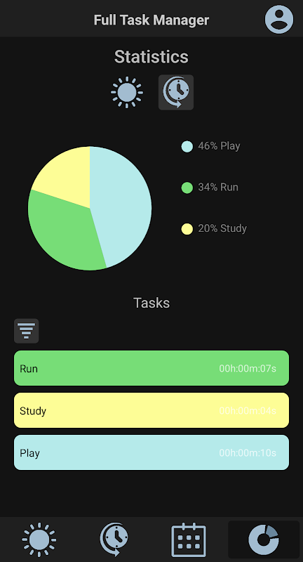 Statistics and Cloud Sync: Full Task Manager provides detailed statistics showing how many tasks you've completed and which timed tasks are the most repeated. Additionally, your progress is securely saved to the cloud with a user account, allowing you to access your information from any device.