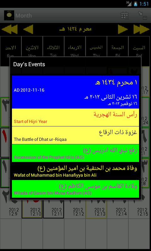 And it shows special events (holidays, occasions, etc) for each day of each month of the year, like Eid ul Fitr, Eid ul Adha, and 127 other events, which you can delete and edit, and you can add events of your own.