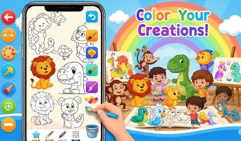 The app includes a wide range of drawing options, coloring tools, stickers, text styles, and brush types to make every creation fun and unique.