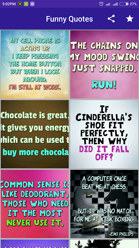 Funny quotes is an application that offers you a multitude of funny quotes and sayings with images that will make you reflect and see things differently in those times when you are when you start the day happy.