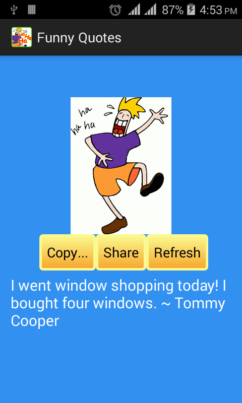 The Funny Quotes app is a collection of funny quotations, selected to tickle your funny bone. It also has a page of random humorous quotes that can be copied (and pasted) on facebook, and shared via sms, email and other social networks.