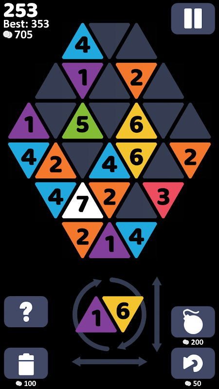 • The number 7 triangle is the highest block. Merge or fusion of the number 7 triangles explodes surrounding cells, giving lots of points and clearing the cells.
