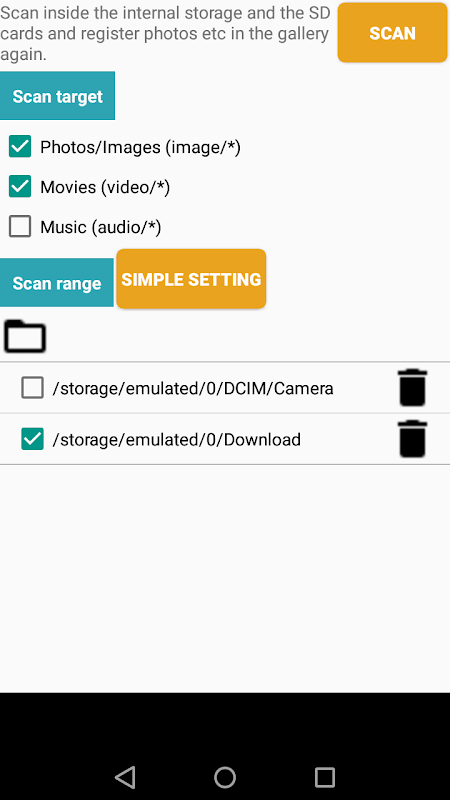 You can specify internal storage and SD cards as the scanning range.