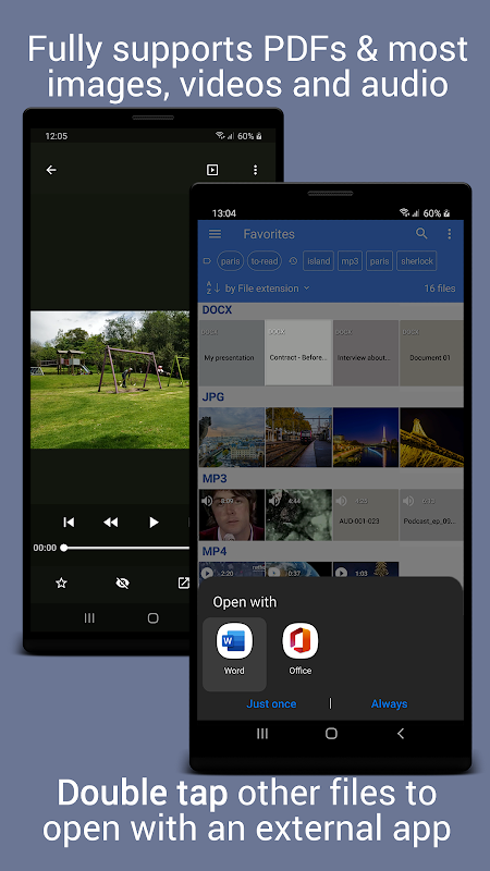 • GalleryDroid shows files of any type, including those it can't open. Double tap a file to open it with an external app
