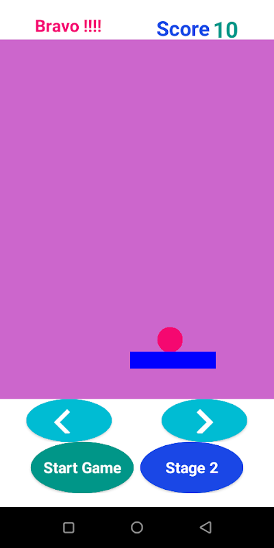 The application consists of three windows; the first is reserved for the first stage; the user will try not to let the ball reach the edge of the frame (field), if he manages to block the ball 10 times he will succeed in the first stage a message will be displayed at the top congratulating him (Bravo) he will have the possibility of starting the second stage, if he doesn't arrive he just has to play the game again.