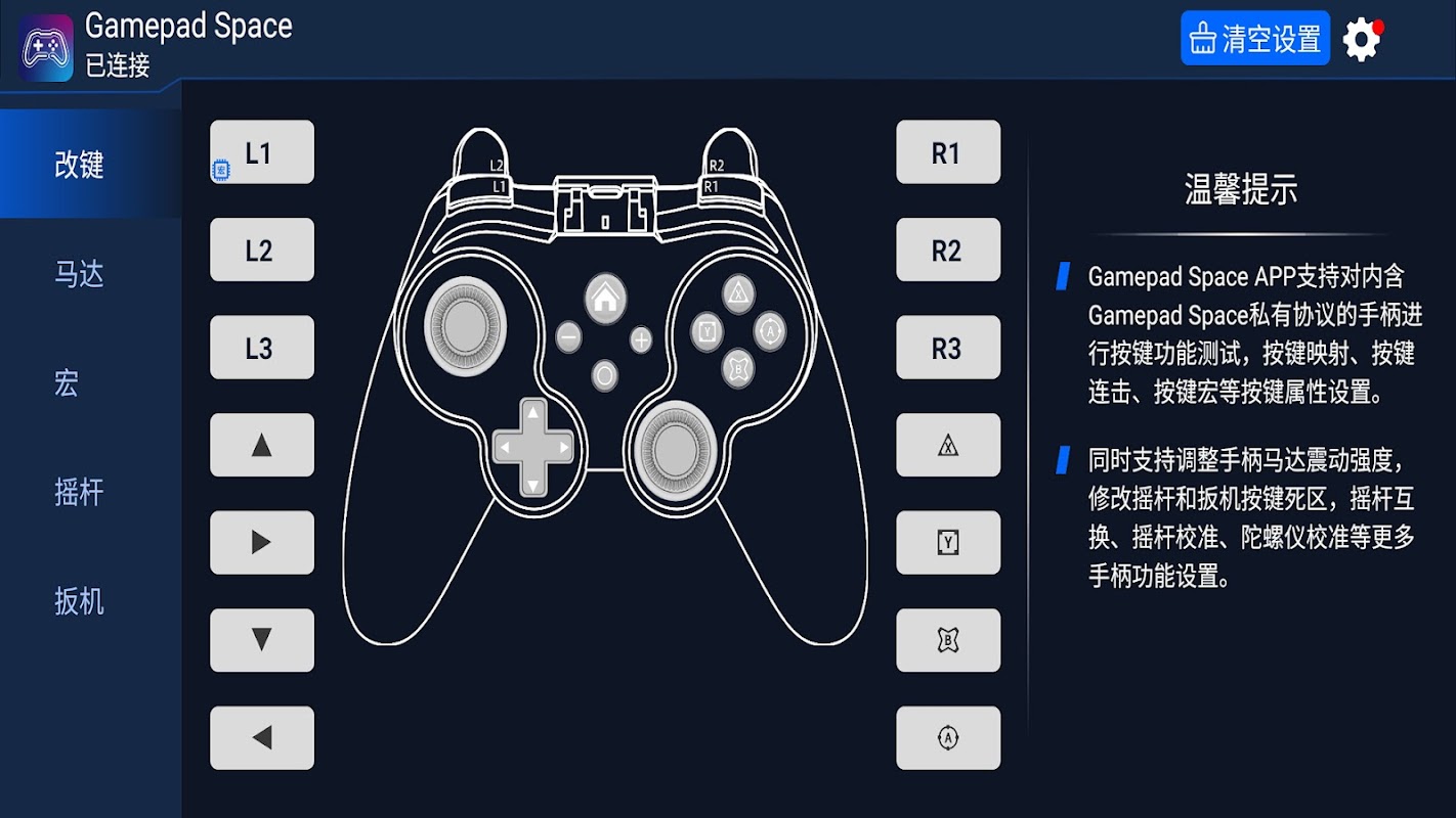 Gamepad Space is a tool APP that can customize the function settings of Bluetooth controller button mapping, button combo, motor properties, button macros, trigger button dead zone, joystick dead zone and joystick mapping after private protocol connection. By modifying the custom button mapping, button combo, motor properties, button macros, trigger button dead zone, joystick dead zone and joystick mapping, etc., the key positions can be adapted to the player's own operating habits or the game the player wants to play.
