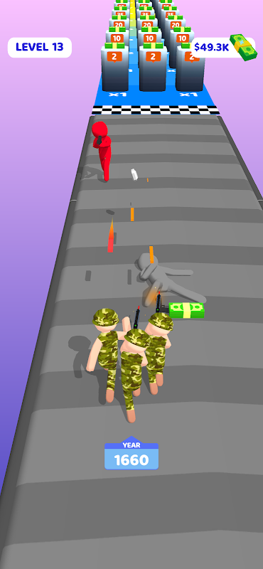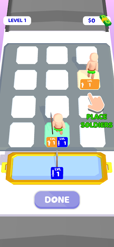 Build your army with the strongest soldiers and weapons! Place them wisely to win the war! Upgrade your rate, range and year stats within the level by using doors! At the end of the level, reach to the further point!