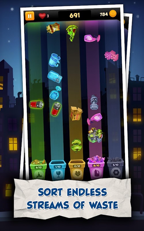 Endless streams of organic, plastic, glass, paper and metal trash require urgent recycling. But avoid the batteries. Failure to properly dispose of hazardous waste will have deadly consequences. Sort out the garbage, protect the environment, get higher scores to unlock new items, bins and more lives.