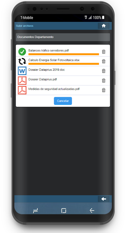 Gardians Cloud permite navegar por las carpetas y los archivos almacenados en su cuenta Gardians Cloud. Los archivos pueden ser abiertos y enviados por email. También es posible subir archivos desde el dispositivo hacia las carpetas Gardians Cloud.