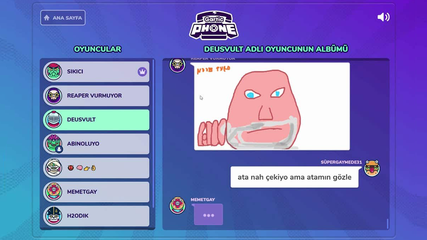 Playing gartic phone app you are gonna have fun guessing and drawing! Every round a Player is chosen to draw something for the others to guess what it is.