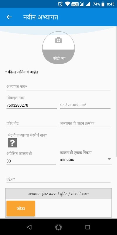 The app allows the Security at the entrance to capture the details of Visitors such as Name, Mobile Phone, Apartment # being visited, purpose, duration of stay etc. The app has a unique capability to verify and validate the mobile phone number given by a visitor to ensure incorrect details are not given creating a security lapse.