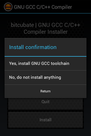 This app installs the GNU GCC Compiler to SDCard. You need to have 200 MB free space.