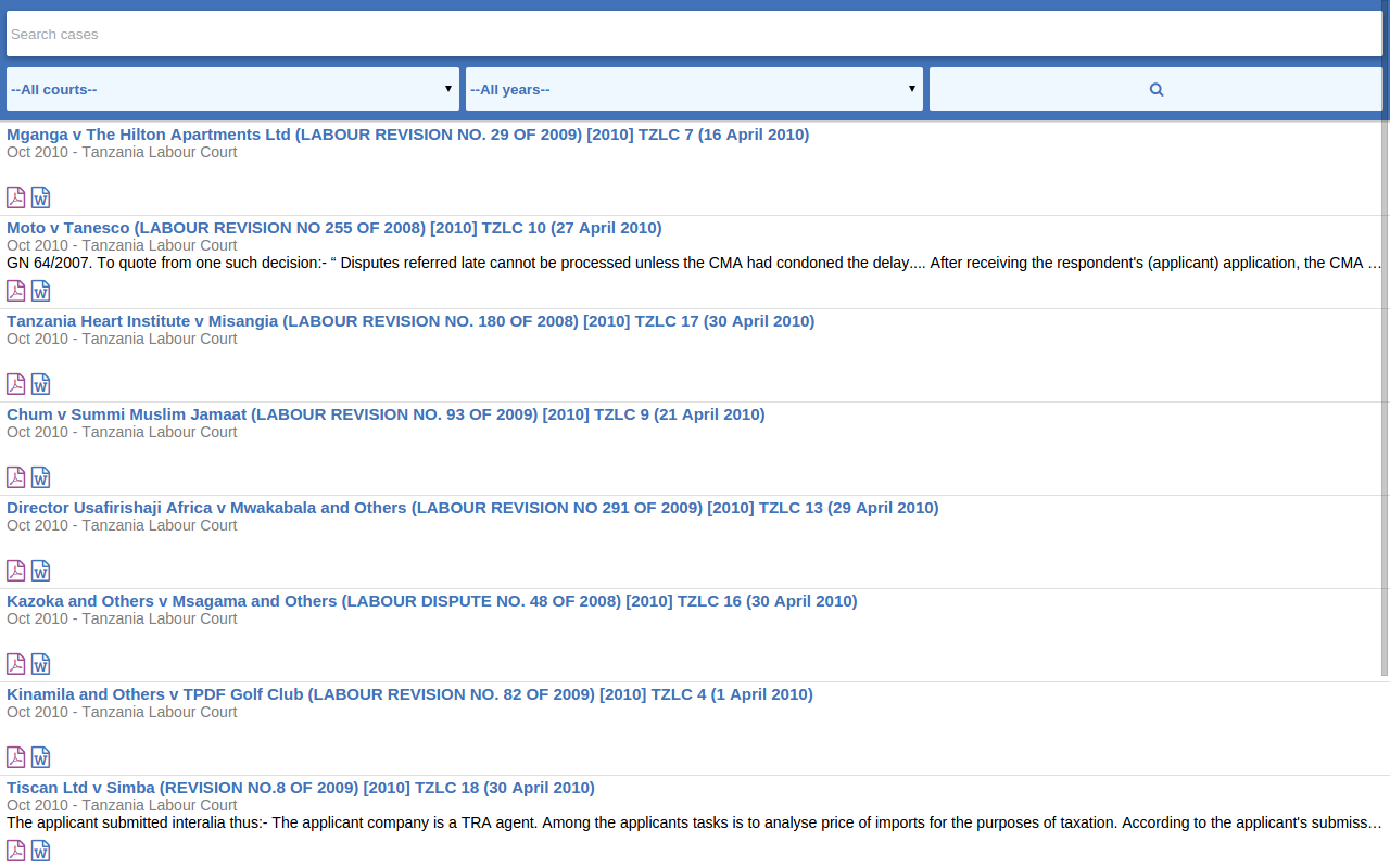 Our legal library makes it easy for you to find Tanzania court case documents. You get access to case files from the Tanzania High Court, Tanzania Court of Appeal and Tanzania Labour Court, dating back from 1986 in PDF or RTF format.