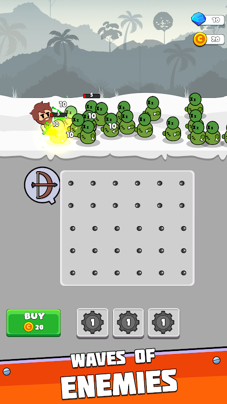 In Gear Clash, your goal is to protect your base by adding and merging gears. Each gear you collect can be upgraded to make your weapons stronger. Place your gears on a grid to build strong defenses that can stop even the toughest enemies. The better you merge your gears, the more powerful your attacks become, helping you fight off bigger and badder foes.