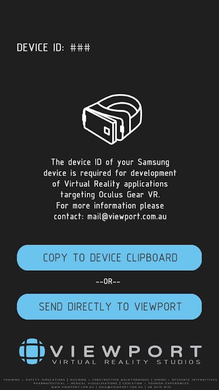 With this application you will be able to easily view your device ID and either copy it to your device clipboard to be shared with anyone or send it directly to Viewport Digital.