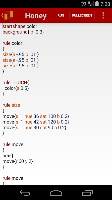 Using Generate you can create beautiful graphics that grow and evolve using a concise scripting language (based on the Context Free language, lightly altered for Android).