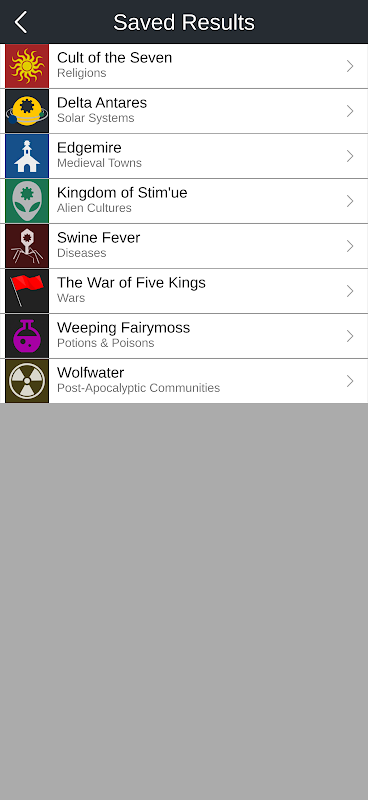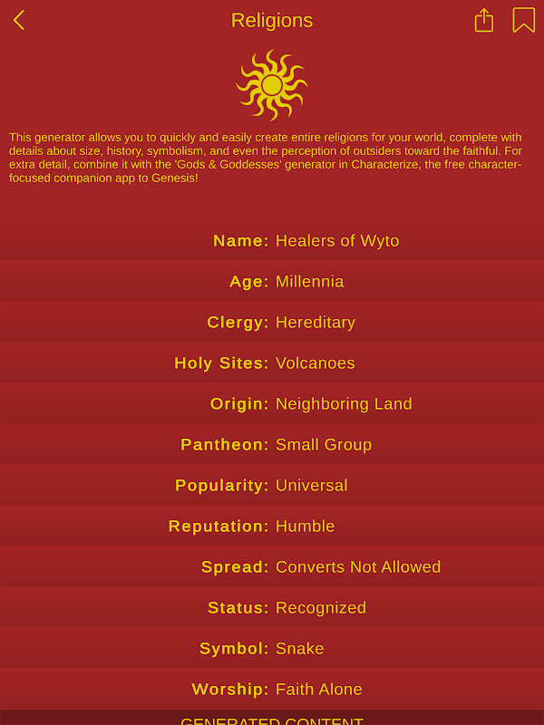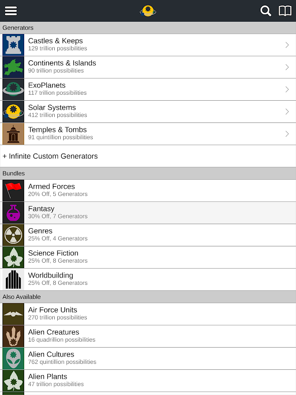 - Tap to fill your worlds with detail. Generate unique characters, technologies, magical artifacts, religions, and more. Bring depth to any story in seconds.