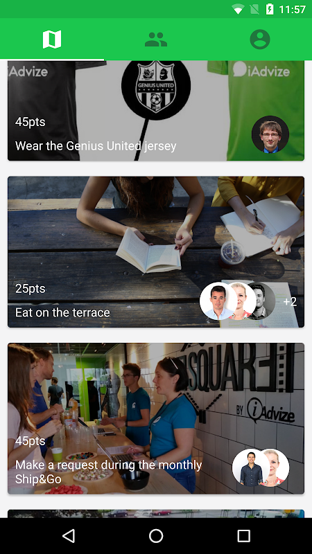 - Validate different photo challenges such as attending an iAdvize seminar, eating chocolate with someone on the Marketing team or taking a coffee break with someone on the R&D team. To validate a challenge, iAdvize geniuses have to take a photo of them completing it and post it on the app to prove they've actually done it.